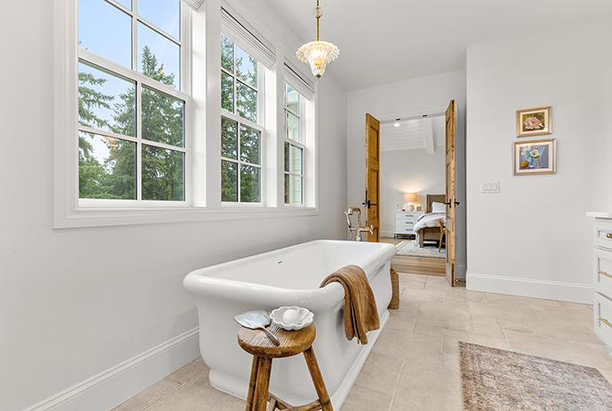 This completely custom home was built in Felida Overlook, home of the 2021 NW Natural Parade of Homes. This 3,337 square foot home has an open concept floor plan and amazing outdoor living spaces. The great room has a beamed vaulted ceiling and focal point fireplace flanked by built-in lighted shelving. The primary bedroom suite is located upstairs and has tongue and groove vaulted beamed ceiling, and a cozy fireplace for the ultimate in relaxation and luxury. Designer features are located throughout this home, including tongue and groove panels, checkerboard diamond tile flooring, lighting and plumbing fixtures, and round windows.